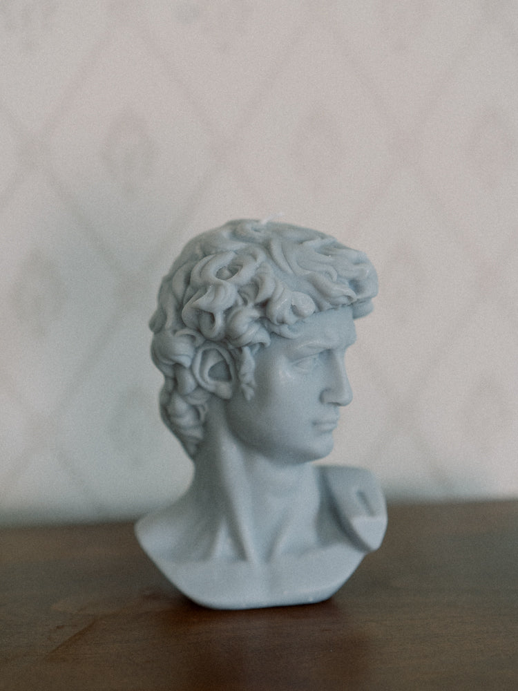A sense of naturalism is conveyed in the way the body stands determined, a confident glare on the young mans face. Because David is a symbol of strength and youthful beauty, we could only call our male bust candle by his name.